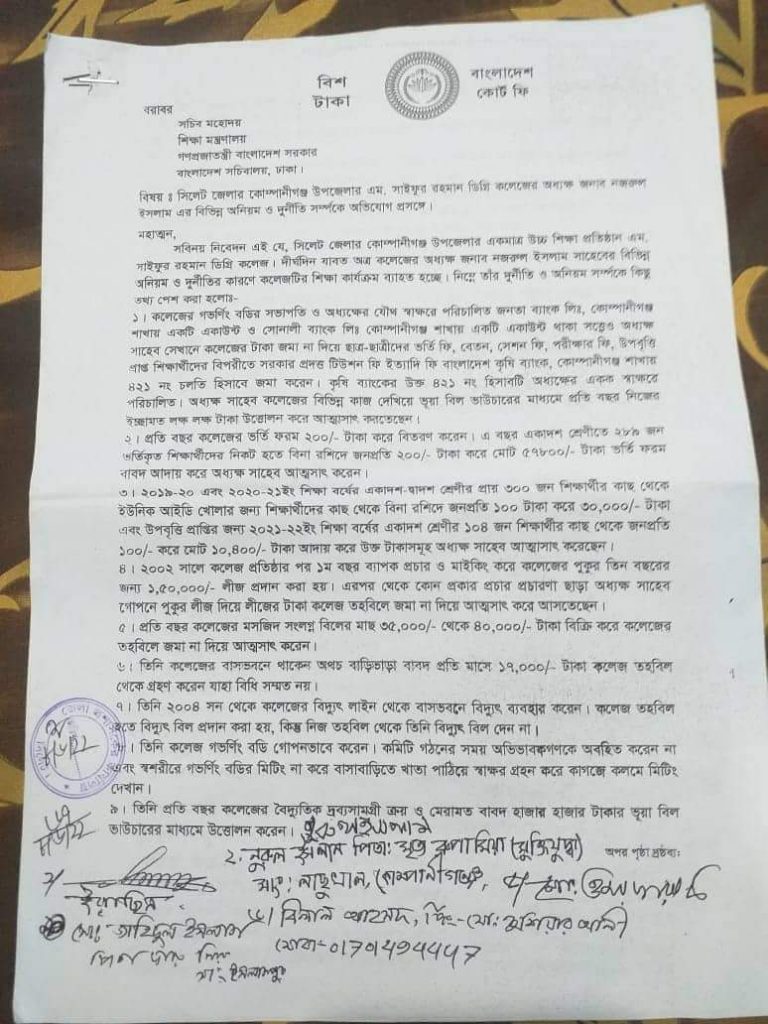 সুপার বাংলা ডেস্ক: সিলেটের কোম্পানীগঞ্জ উপজেলার একমাত্র উচ্চ শিক্ষালয় এম সাইফুর রহমান ডিগ্রী কলেজের অধ্যক্ষ নজরুল ইসলামের বিরুদ্ধে ব্যপক দুর্নীতি ও অনিয়মের অভিযোগ তুলে শিক্ষা মন্ত্রণালয়ে লিখিত অভিযোগ করেছেন স্থানীয় অভিভাবক সদস্য ও সচেতন মহল। অধ্যক্ষ নজরুল অনিয়ম, দুর্নীতি,স্বেচ্ছাচারিতা, কলেজের কৃষি ব্যাংক হিসাব নং-৪২১ থেকে একক সাইনে কলেজের অর্থ জমা ও উত্তোলনের মাধ্যমে প্রতিষ্ঠানের লক্ষ লক্ষ টাকা লেনদেনের অভিযোগ এনে গত ০৮ জুন লিখিত অভিযোগ দিয়েছেন স্থানীয়রা।