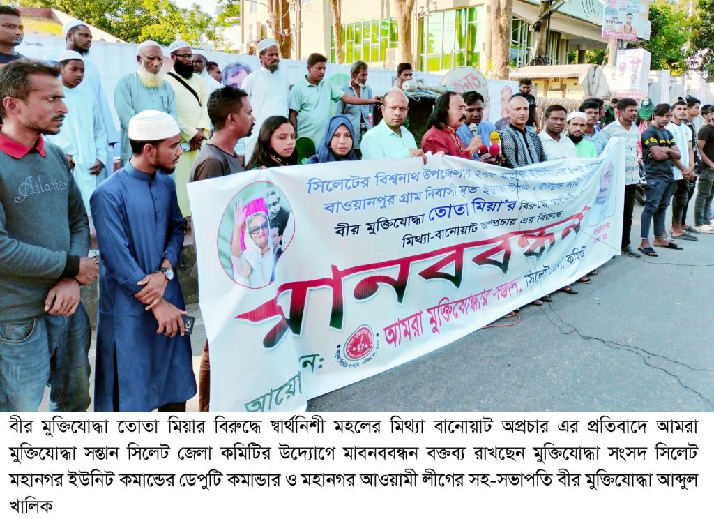 মানববন্ধনে বক্তরা বলেন প্রকৃত মুক্তিযোদ্ধার বিরুদ্ধে অপ্রচার বরদাশত করা হবে না। অবিলম্বে বীর মুক্তিযোদ্ধা তোতা মিয়ার বিরুদ্ধে স্বার্থনিশী মহলের মিথ্যা বানোয়াট অপ্রচার প্রত্যাহার করতে হবে। এর প্রতিবাদে তীব্র নিন্দা ও প্রতিবাদ জানানো হয়।