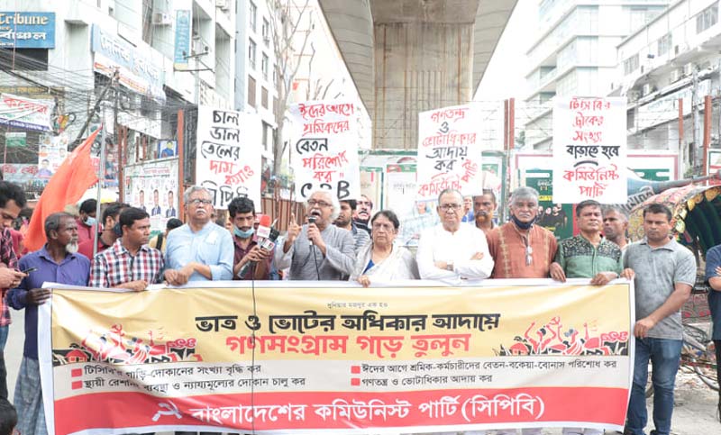 বাংলাদেশের কমিউনিস্ট পার্টি (সিপিবি) আয়োজিত অবস্থান-সমাবেশে নেতৃবৃন্দ বলেছেন, দেশে ‘আধাপেট খাওয়া মানুষের সংখ্যা বাড়ছে। আয় কমে যাওয়ায় আর নিত্যপণ্যের দাম বাড়ায় সাধারণ মানুষ সংকটে। এসব মানুষকে বাঁচাতে সারা দেশে পর্যাপ্ত ন্যায্যমূল্যের দোকান ও রেশনিং ব্যবস্থা চালু করতে হবে। অতি দরিদ্রদের নগদ সহায়তা দিতে হবে।