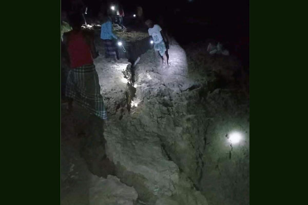সুনামগঞ্জের তাহিরপুর উপজেলার মাটিয়ান হাওরের ফসল রক্ষা বাধে ফাটল দেখা দিয়েছে।