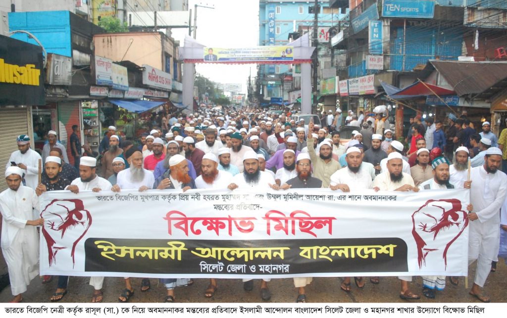সুপার বাংলা ডেস্ক:: ভারতে বিজেপি নেত্রী কর্তৃক রাসূল (সা) কে নিয়ে অবমাননাকর মন্তব্যের প্রতিবাদে বিক্ষোভ মিছিল করেছে ইসলামী আন্দোলন বাংলাদেশ সিলেট জেলা ও মহানগর শাখা। শুক্রবার বাদ জুম’আ সিলেট কেন্দ্রীয় জামে মসজিদের সামনে থেকে বিক্ষোভ মিছিলটি বের হয়ে নগরীর বিভিন্ন সড়ক প্রদক্ষিণ শেষে চৌহাট্টা পয়েন্টে গিয়ে দোয়ার মাধ্যমে সমাপ্ত হয়।