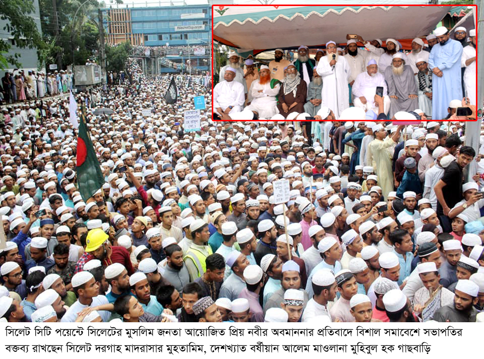 দারুল উলুম কানাইঘাট মাদরাসার শায়খুল হাদীস বর্ষীয়ান আলেম, মাওলানা আলিমুদ্দিন দুর্লভপুরী বলেন, মহানবী সঃ কে মুসলিম জাতি প্রানের চেয়ে বেশি ভালোবাসে। নবীর অবমাননার প্রতিবাদ করা আমাদের ঈমানী দায়িত্ব। সিলেটের প্রায় শতাধিক মাদরাসা মসজিদ স্কুল কলেজ ও বিশ্ববিদ্যালয়ে হাজার হাজর নবিপ্রেমিক জনতা অংশগ্রহণ করেন।