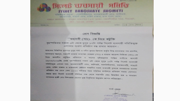 বুধবার (১৪ জুন) এক বিবৃতিতে ব্যবসা প্রতিষ্ঠান বন্ধ রাখার আহবান জানান সিলেট ব্যবসায়ী সমিতি সভাপতি জিয়াউল হক ও সাধারণ সম্পাদক হাজী মোঃ দিলদার হোসেন।