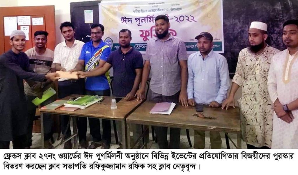 ফ্রেন্ডস ক্লাব ২৭নং ওয়ার্ড সভাপতি রফিকুজ্জামান রফিক এর সভাপতিত্বে এবং সাধারণ সম্পাদক নজরুল ইসলাম রাজিব ও সহ-সাধারণ সম্পাদক সুজিত চন্দ এর যৌথ পরিচালনায় ঈদ পুণর্মিলনী অনুষ্ঠানে অতিথি হিসেবে উপস্থিত ছিলেন ফ্রেন্ডস ক্লাবের উপদেষ্টা মঞ্জুর আহমদ চৌধুরী, জাহাঙ্গীর হোসেন রাজ, নজরুল ইসলাম।