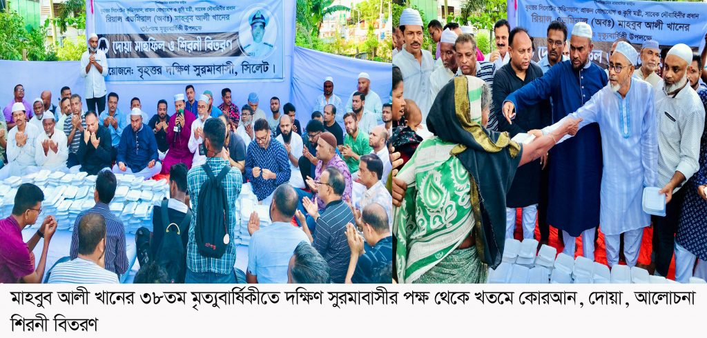 সুপার বাংলা ডেস্ক: বাংলাদেশ সরকারের সাবেক মন্ত্রী ও নৌবাহিনীর প্রধান, বৃহত্তর সিলেটের কৃতি সন্তান রিয়ার এডমিরাল মাহবুব আলী খানের ৩৮তম মৃত্যুবার্ষিকী উপলক্ষে দক্ষিণ সুরমাবাসীর পক্ষ থেকে খতমে কোরআন, দোয়া, আলোচনা সভা ও শিরনী বিতরণ শনিবার (৬ আগষ্ট) বিকেল ৪টায় দক্ষিণ সুরমা চন্ডিপুলে অনুষ্ঠিত হয়েছে।