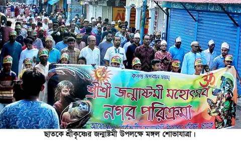 ছাতক প্রতিনিধিঃ ছাতকে সনাতন ধর্মাবলম্বিদের ধর্মীয় উৎসব ভগবান শ্রীকৃষ্ণের জন্মাষ্টমী মহোৎসব ধর্মীয় বিভিন্ন আনুষ্ঠানিকতার মধ্য দিয়ে পালিত হয়েছে। জন্মাষ্টমী উপলক্ষে সকালে শহরের মহাপ্রভুর আখড়া প্রাঙ্গন হতে বের করা হয় শ্রীকৃষ্ণের প্রতীকৃতি সহ এক বর্নাঢ্য শোভাযাত্রা। শোভাযাত্রার আনুষ্ঠানিক উদ্বোধন করেন ছাতক পৌরসভার মেয়র আবুল কালাম চৌধুরী। সকল বয়সের নারী-পুরুষ ও শিশুরা এ মঙ্গল শোভাযাত্রায় অংশ নেন। শোভাযাত্রাটি শহরের প্রধান-প্রধান সড়ক প্রদক্ষিণ শেষে আখড়া প্রাঙ্গনে এসে শেষে হয়। জন্মাষ্টমী উৎসব কমিটির সভাপতি মহন্ত কুমার রায়ের সভাপতিত্বে ও সাধারন সম্পাদক কালিদাস পোদ্দারের পরিচালনায় শোভাযাত্রা শেষে অনুষ্ঠিত পথ সভায় বক্তব্য রাখেন, উপজেলা পূজা উদযাপন পরিষদের সভাপতি এড. পীযুষ কান্তি ভট্টাচার্য্য। শোভাযাত্রায় পৌর মহিলা কাউন্সিলর রত্না মালাকার, উপজেলা পূজা উদযাপন পরিষদের সাধারন সম্পাদক রবীন্দ্র কুমার দাস, উপজেলা হিন্দু-বৌদ্ধ-খ্রীস্টান ঐক্য পরিষদের সভাপতি, প্রাক্তন অধ্যাপক হরিদাস রায়, সাধারন সম্পাদক বাবুল পাল, অবসরপ্রাপ্ত কর্মকর্তা কৃষ্ণদাস রায়, উপজেলা পূজা উদযাপন পরিষদের যুগ্ম সম্পাদক বিজয় রায়, মহাপ্রভু আখড়া পরিচালনা কমিটির সাধারন সম্পাদক চম্পু দত্ত, স্থানীয় পীযুষ দাস, স্বúন তরফদার, ব্যবসায়ী অমর দেবনাথ, স্বপন পাল, শিক্ষক অজয় কৃষ্ণ পাল, বঙ্কিম চন্দ্র আচার্য্য, দুলন তরফদার, গোবিন্দ চক্রবর্ত্তী, সঞ্জয় কর, মহাপ্রভু আখড়া পরিচালনা কমিটির অর্থ সম্পাদক গোবিন্দ ঘোষ, উৎসব কমিটির সৌরভ দাস, চয়ন দে সহ সনাতন ধর্মাবলম্বি লোকজন অংশ নেন। সন্ধ্যায় জন্মাষ্টমী উপলক্ষে মহাপ্রভু আখড়া প্রাঙ্গনে অনুষ্ঠিত হয় এক মনোজ্ঞ সাংস্কৃতিক অনুষ্ঠান।